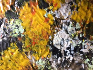 I also made fused plastic panels using the same approach to colours, but melting together the plastic in artworks resembling painting. These have been installed on a wall inside the hut, floating away from the wall and attached with copper roof nails.