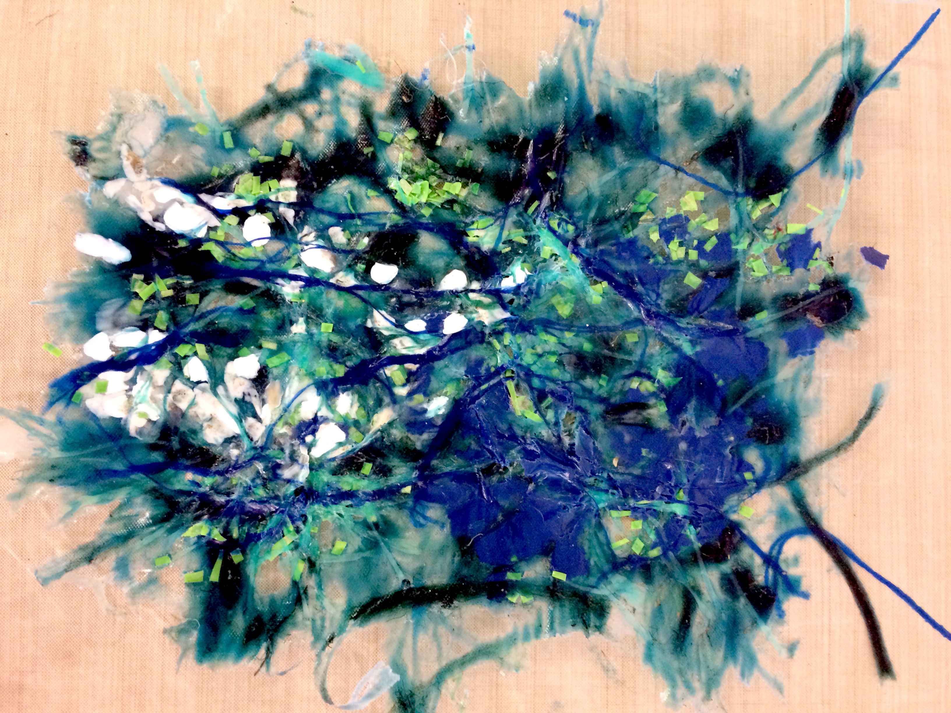 I also made fused plastic panels using the same approach to colours, but melting together the plastic in artworks resembling painting. These have been installed on a wall inside the hut, floating away from the wall and attached with copper roof nails.