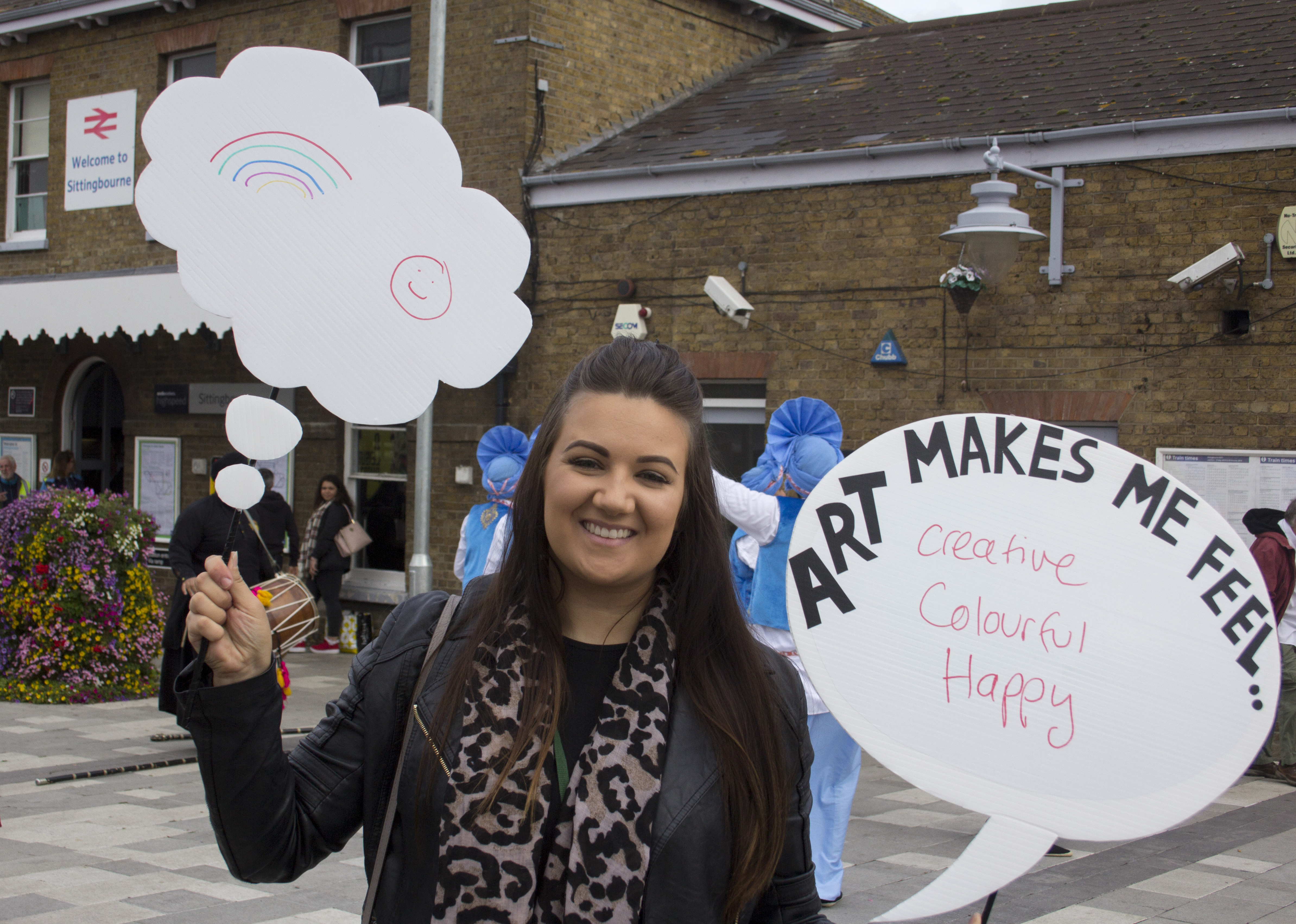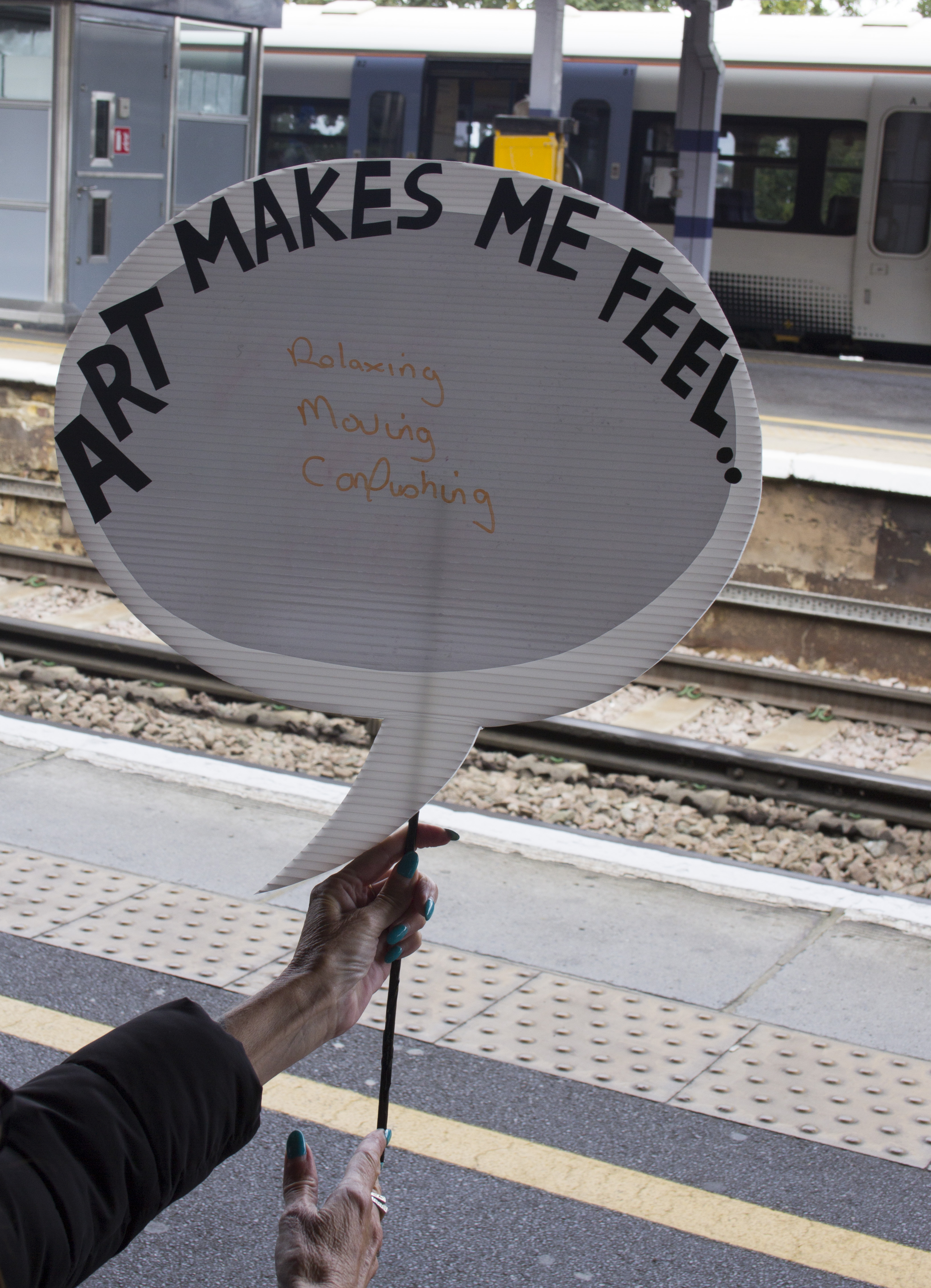 I developed the idea to provoke a response to the question ‘How does art make you feel’, and this was carried through the graphic design and a series of community activities. Working with LV21, I chatted with passengers on the train stations and people in the towns around them, asking about the Turner Prize, and if they could tell me how art made them feel in three words. Some allowed us to photograph them with their thoughts in cartoon bubbles.