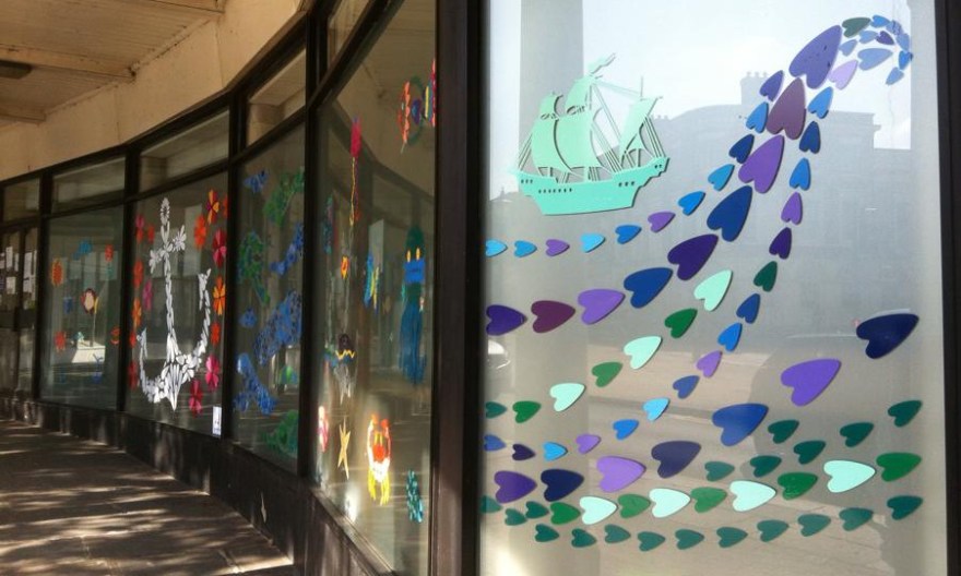 Working with LV21 in summer 2015, I was commissioned to develop colourful artworks to improve the appearance of six large grey windows of a drop-in centre in the crescent adjacent to the clock tower in Gravesend.